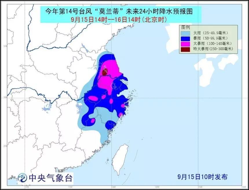 降水预报:15日14时至16日14时,福建北部、浙江、江西东北部、江苏大部、安徽东部和南部、上海等地有大雨或暴雨,其中,福建西北部、浙江中部和西北部、安徽东南部、江苏中南部等地的部分地区有大暴雨,局地有特大暴雨(250~300毫米),并伴有小时雨强30~60毫米的短时强降水、最大可达80毫米以上。