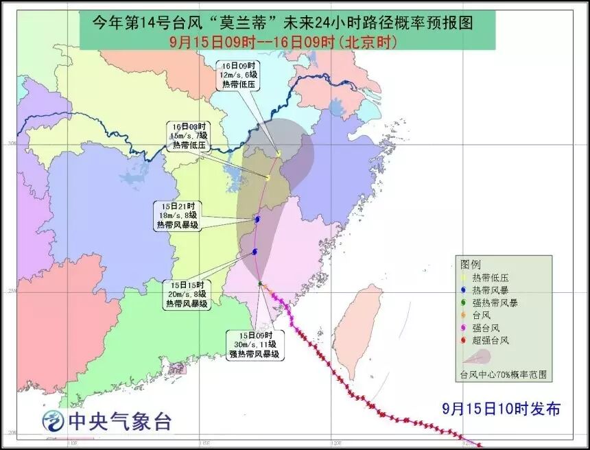 今天上午9点,“莫兰蒂”其中心位于福建省龙岩市新罗区境内。接下来它将继续向北偏西方向移动,在今天后半夜或明天凌晨进入江西东北部,并减弱为热带低压,随后继续影响华东其他地方。