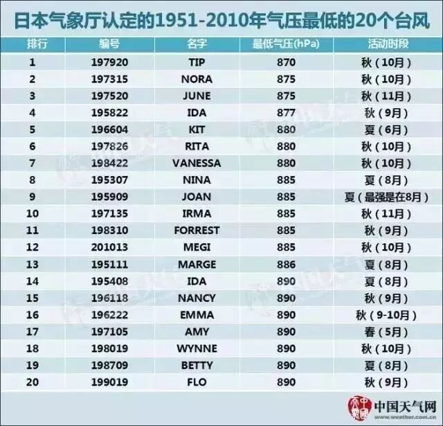 据日本气象厅统计,1951-2010年间,气压最低(通常气压越低,强度越强)的前20个台风中,秋台风占据了13席,达到了65%,而夏台风只占据了6席,占比30%。目前西北太平洋上的几个最强纪录保持者,也都是清一色的秋台风。比如全球有确切纪录以来强度最强的一个台风——1979年第20号“Tip”,是当年10月的产物。还有2013年的超强台风“海燕”,生于深秋的11月,也无愧于当年的“风王”称号。
