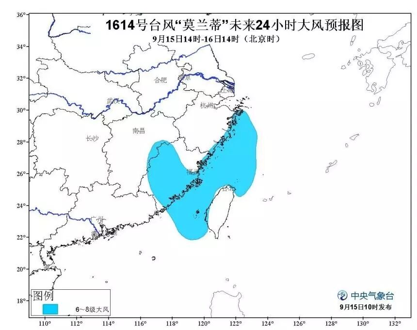 大风预报:15日14时至16日14时,台湾海峡、东海西南部及浙江沿海、台湾西部沿海、福建西部和南部及其沿海将有6~8级大风,部分海域和地区风力有9级,阵风可达10-11级。