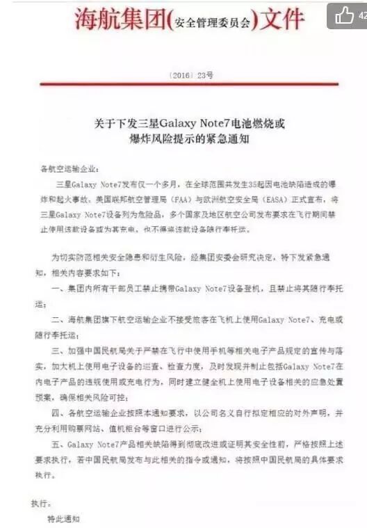 海南航空率先宣布,要求集团内所有员工禁止携带三星Note7设备登机且禁止将其随行李托运,集团旗下航空运输企业不接受旅客在飞机上使用Note7、充电、随行李托运。此外,海航集团运营管理的天津航空、金鹿公务、祥鹏航空、首都航空等航空公司,也统一执行了这一“禁令”。