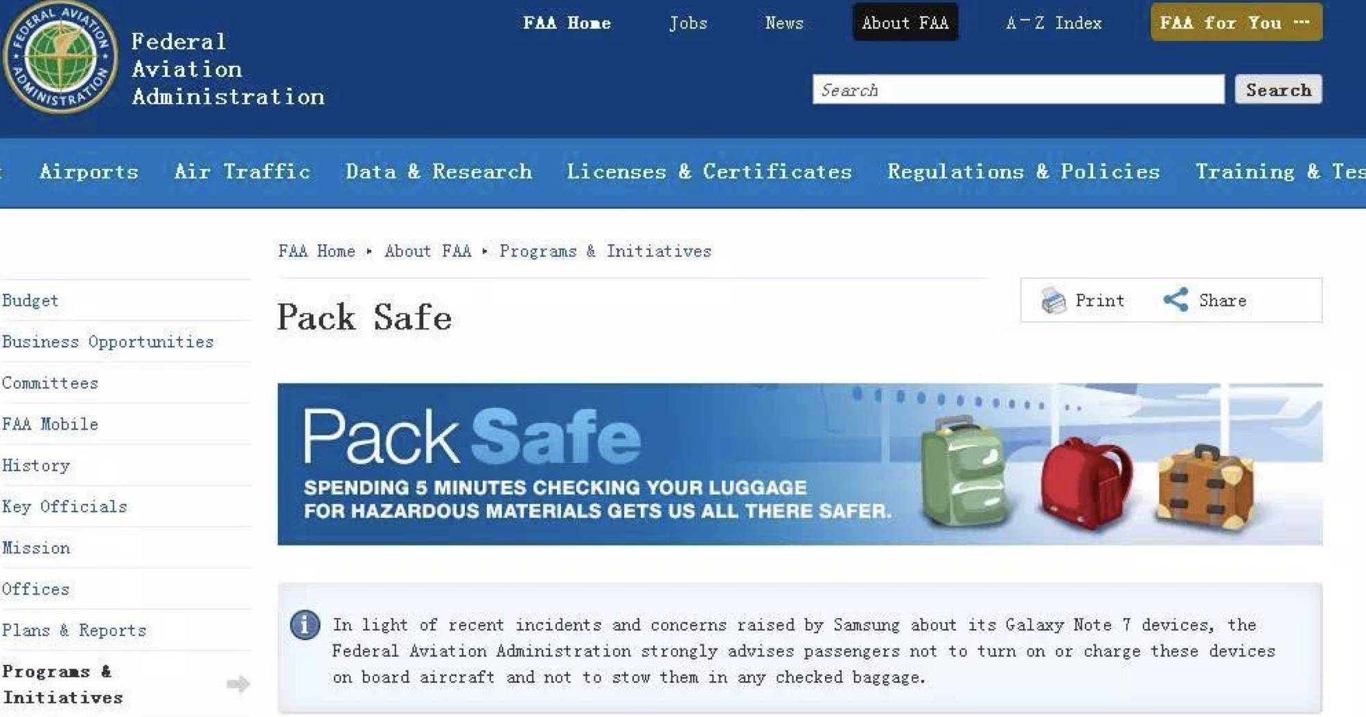 美国联邦航空局发布声明,警告乘客不要在飞行途中打开三星Note7,或者给它充电,也不要将手机托运。