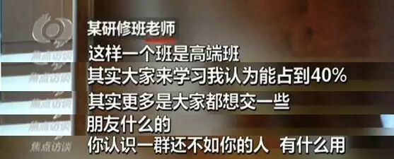 随后,记者又走访了一个高价研修班,在这里,“交朋友”再次成了班级推介的关键词:“每年有好多聚会,结交朋友这块肯定是没有问题的。”