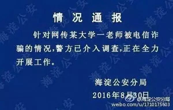 △“清华教授遭电信诈骗”事件警方的通报