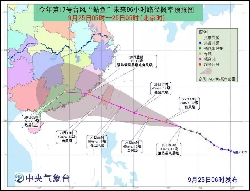 据中央气象台,预计今年第17号台风“鲇鱼” 将于9月28日在福建南部到广东东部一带沿海,以风速30~35米/秒,风力11~12级登陆。