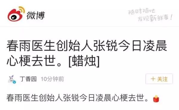 6日凌晨3时,移动医疗平台春雨医生的创始人张锐突发心肌梗塞去世,享年42岁。张锐是一名“70后”,曾经在多家媒体工作。2011年创立春雨医生。