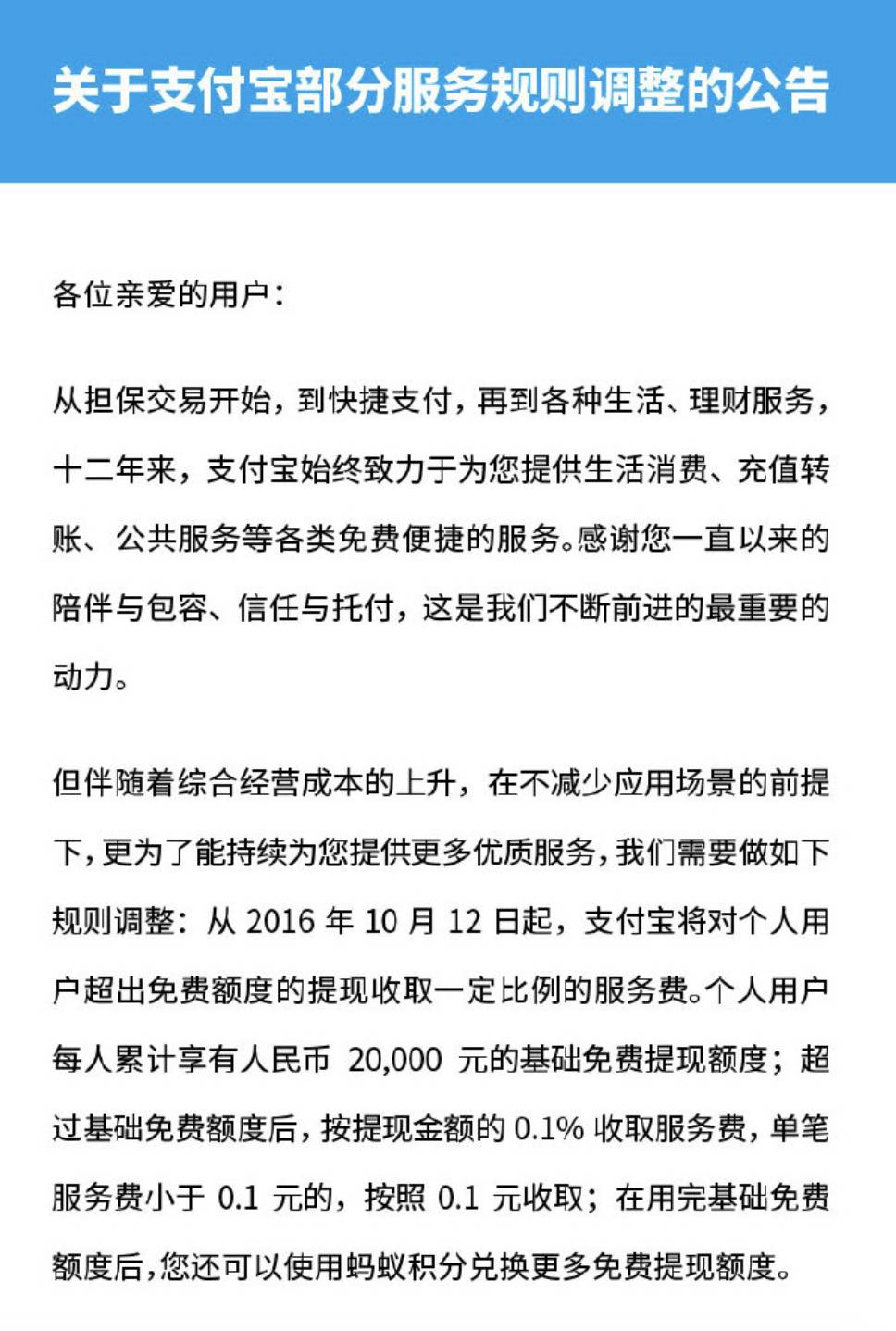 一个月前,支付宝对外发布公告表示,自2016年10月12日起,支付宝将对个人用户超出免费额度的提现收取0.1%的服务费,个人用户每人累计享有2万元基础免费提现额度。这意味着,从今天开始,个人用户从支付宝里超额提现,就要开始缴纳服务费了。