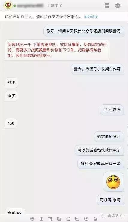 虽然微信系统的升级使得很多“刷量”工具瘫痪,但刷阅读量的需求却还未停止。目前,网上仍能找到很多从事“刷量”的商家,价格从1元到几十元不等。
