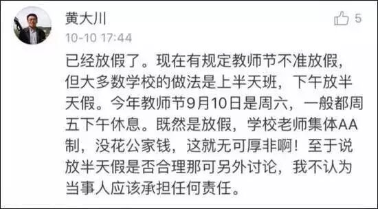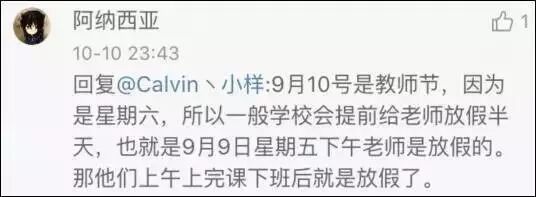 至于老师们为何9月9日周五放假,有网友提到因为9月10日是教师节,一般学校会给老师提前放半天假,这不属于法定假期。