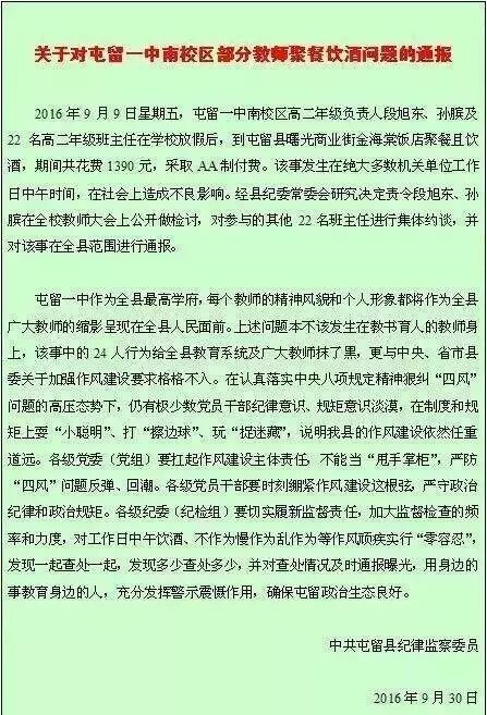 9月30日,山西屯留县纪律监察委员会发布了一篇《关于对屯留一中南校区部分教师聚餐饮酒问题的通报》。通报称,9月9日,山西省长治市屯留县屯留一中南校区高二年级24名老师在学校放假后,到屯留县曙光商业街金海棠饭店聚餐且饮酒,其间共花费1390元,采取AA制付费。