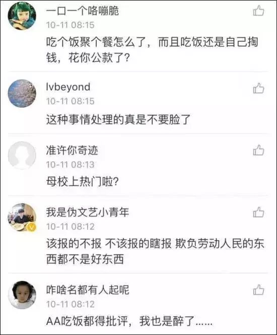 大多数网友对这则通报也表示质疑,通报中提到这几位教师是在学校放假后聚餐,共花费1390元,还是AA制付费,一不是工作日,二不是公费付款,教师节前聚餐庆祝无可厚非,因此,网友对屯留纪委的这份通报表示不理解,纷纷为被通报的教师们抱不平。