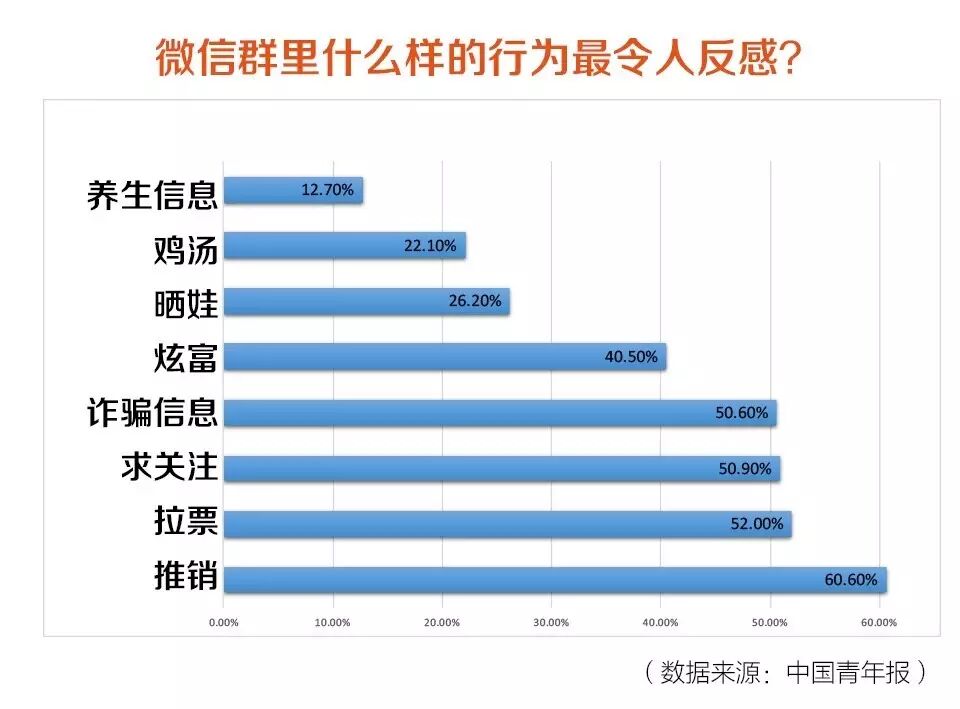 调查发现,推销是受访者最反感的微信群内容,有60.6%的受访者选择了这一项。此外,拉票、刷屏求关注、炫富、晒娃等内容也不同程度地令受访者反感。