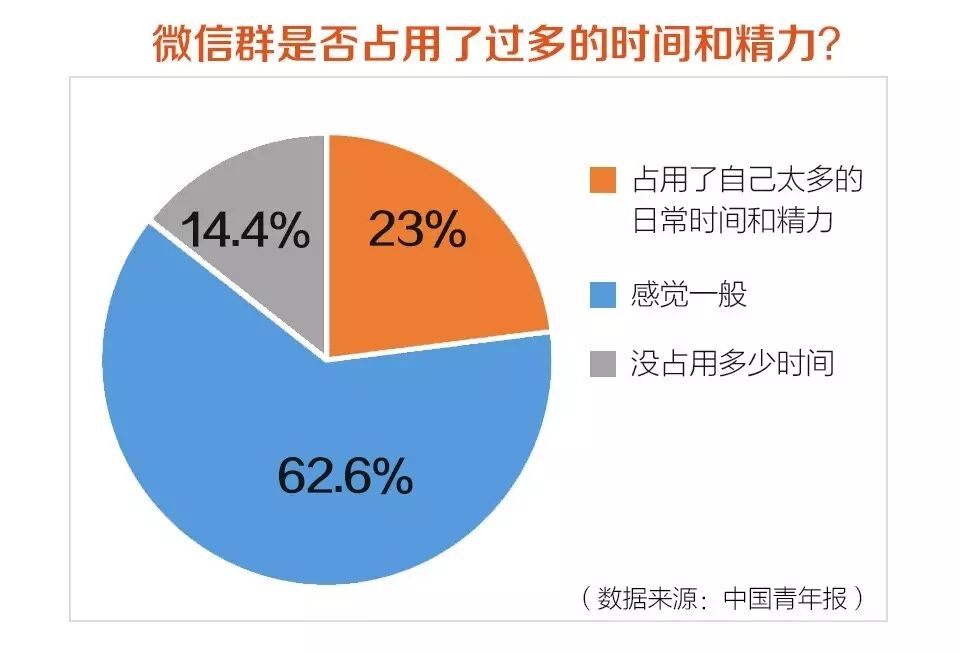 调查发现,23.0%的受访者感觉,微信群占用了自己太多的日常时间和精力,14.4%受访者持相反观点,62.6%的受访者感觉一般。