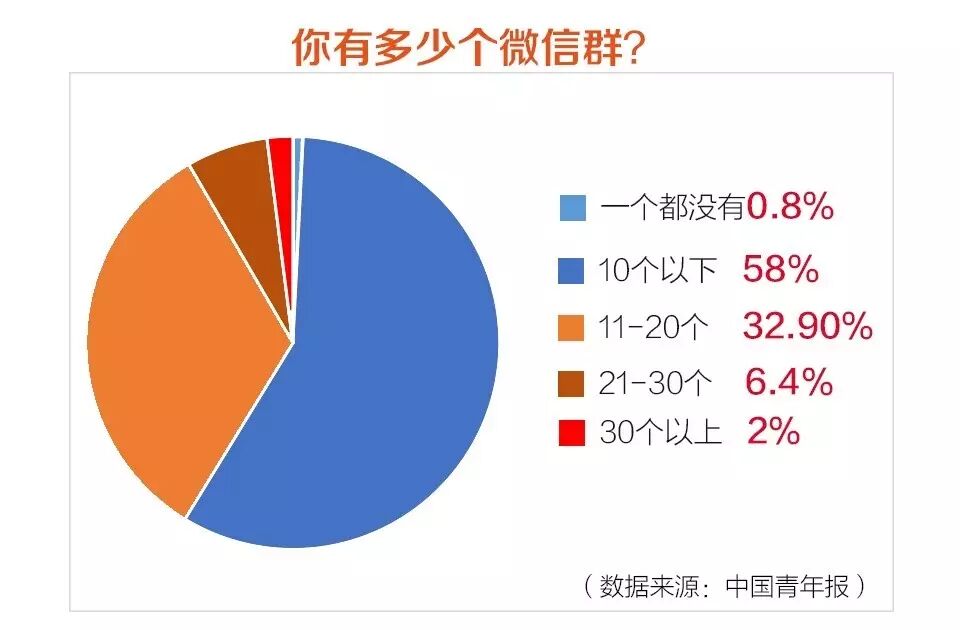 此外,调查显示,只有0.8%的受访者没有加入过任何微信群,绝大多数受访者都加入了数量不等的微信群。