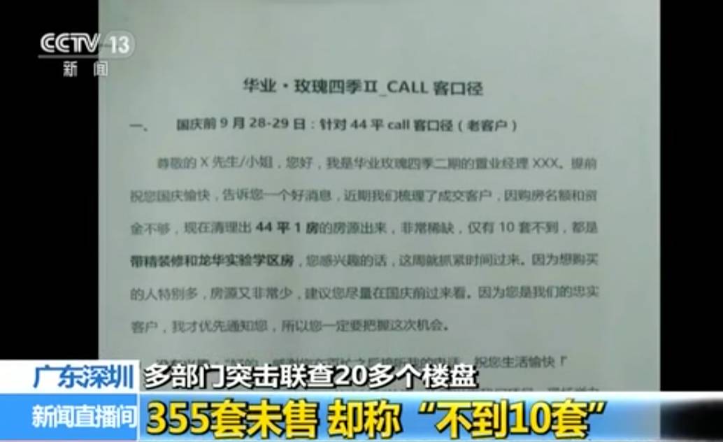 在检查“华业玫瑰四季”这个楼盘时,调查人员发现该楼盘售楼处,有专门向顾客电话推销而准备的“口径”,销售人员在推销楼盘时使用统一用语,比如“因购房名额和资金不够,现在清理出44平1房的房源出来,非常稀缺,仅有10套不到。”,但事实并非如此。
