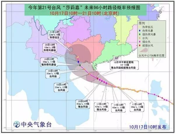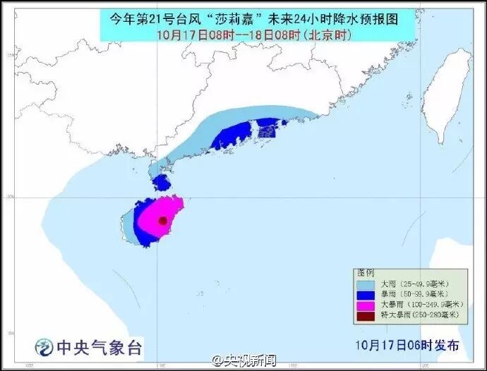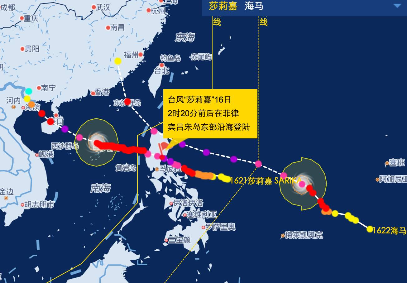 今年第21号台风“莎莉嘉”已于昨日登陆菲律宾吕宋岛东部沿海,预计明日中午前后在海南文昌到陵水一带沿海登陆(强台风级或超强台风级,14-16级,45-52米/秒);明晚将移入北部湾海面(台风级,12~13级,33~38米/秒),明日下午到夜间将在越南东北部到广西西部一带沿海再次登陆。受其影响,今日至19日,海南、广东、广西等地有强风雨。中央气象台今早发布了台风红色预警。