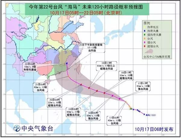 “海马”虽然目前距离我国较远,但它的路径也直指我国华南。中央气象台预计,“海马”将于20日白天进入南海东部海面,之后将逐渐向广东东部到福建南部一带沿海靠近并可能在这一带沿海登陆;19日至23日,“海马”将给东海南部和南海中北部海区及台湾、广东、福建等沿海带来严重的风雨影响。