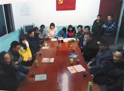 △庄里村两委开会时的照片,图中穿迷彩服者是周炳耀。这是他为数不多的工作照之一。