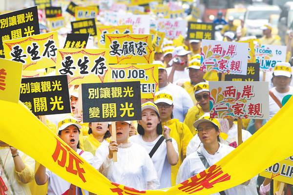 △9月12日,由台湾观光旅游界自发组成的“百万观光产业自救会”,发动逾万人在台北冒雨游行。