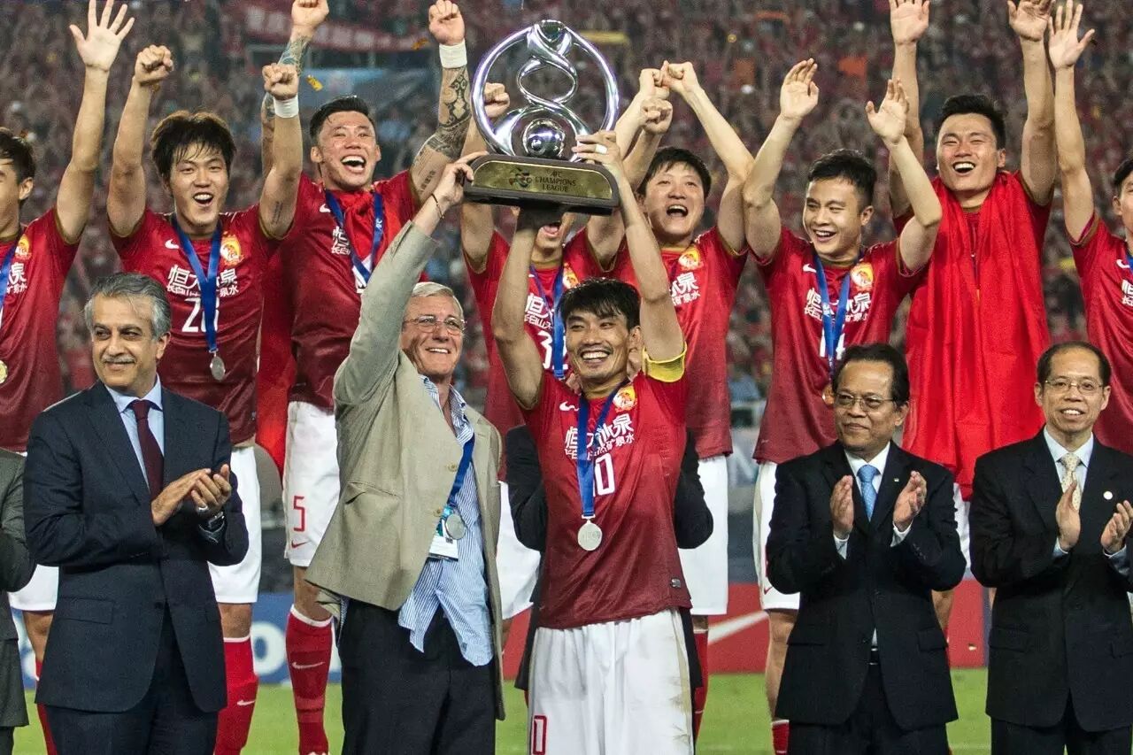 △2013年11月09日,2013亚冠决赛颁奖仪式。里皮,郑智举起冠军奖杯。