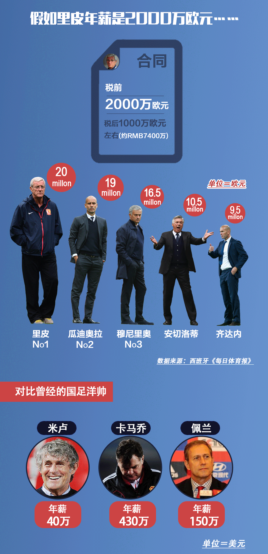 早在国足选帅之前,就传言里皮要和恒大签署一份年薪2000万欧元的合约。恒大可以忍痛割爱放里皮去国足,但里皮作为一个职业教练,对于薪水不可能让步太多。