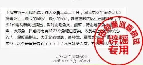 “某某人民医院”、“二点二十分”、“68名男女感染某病毒死亡”、“中央一台电视新闻已播出”、“别吃草鱼酸菜鱼水煮鱼”……这些用词都与当初谣言如出一辙!