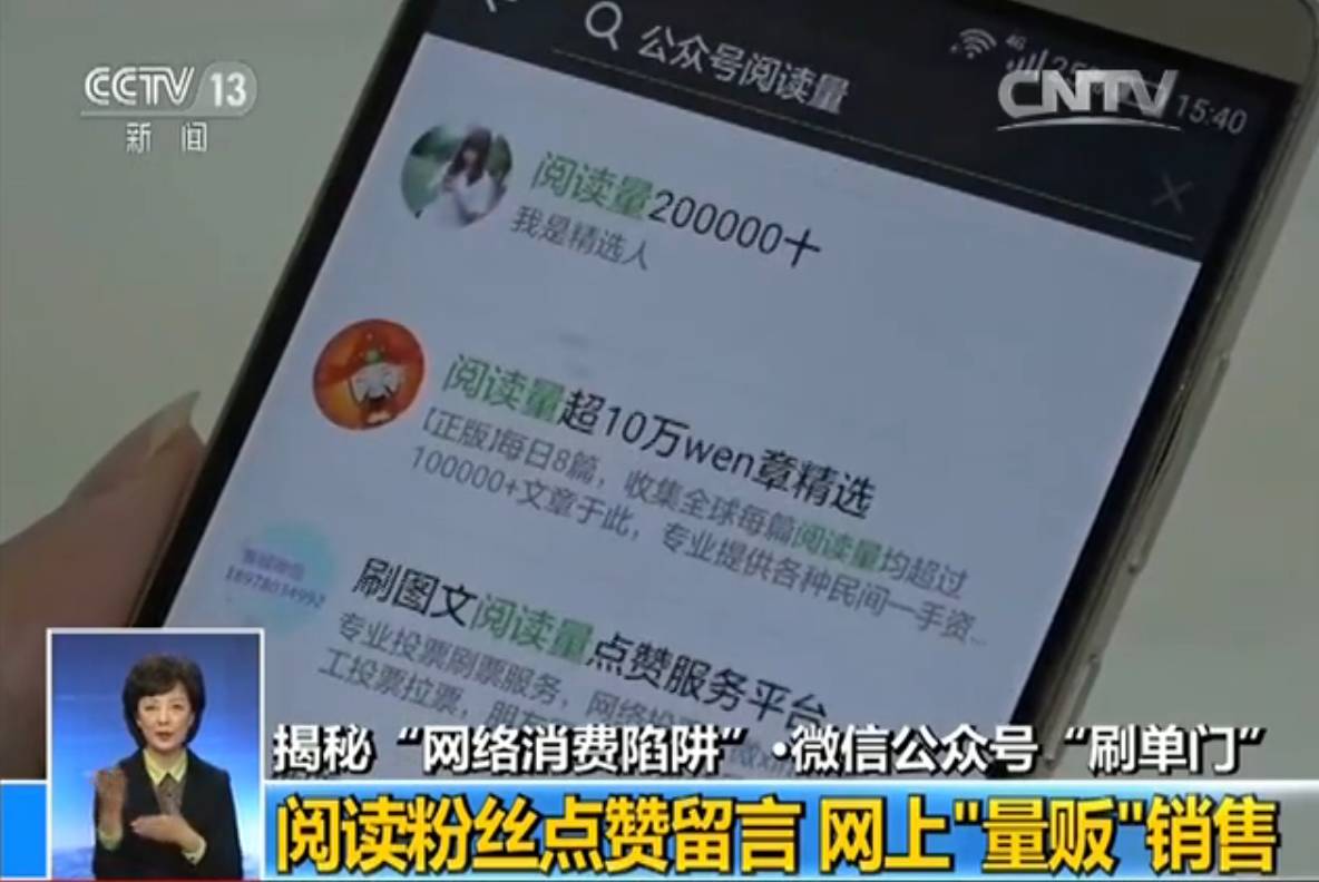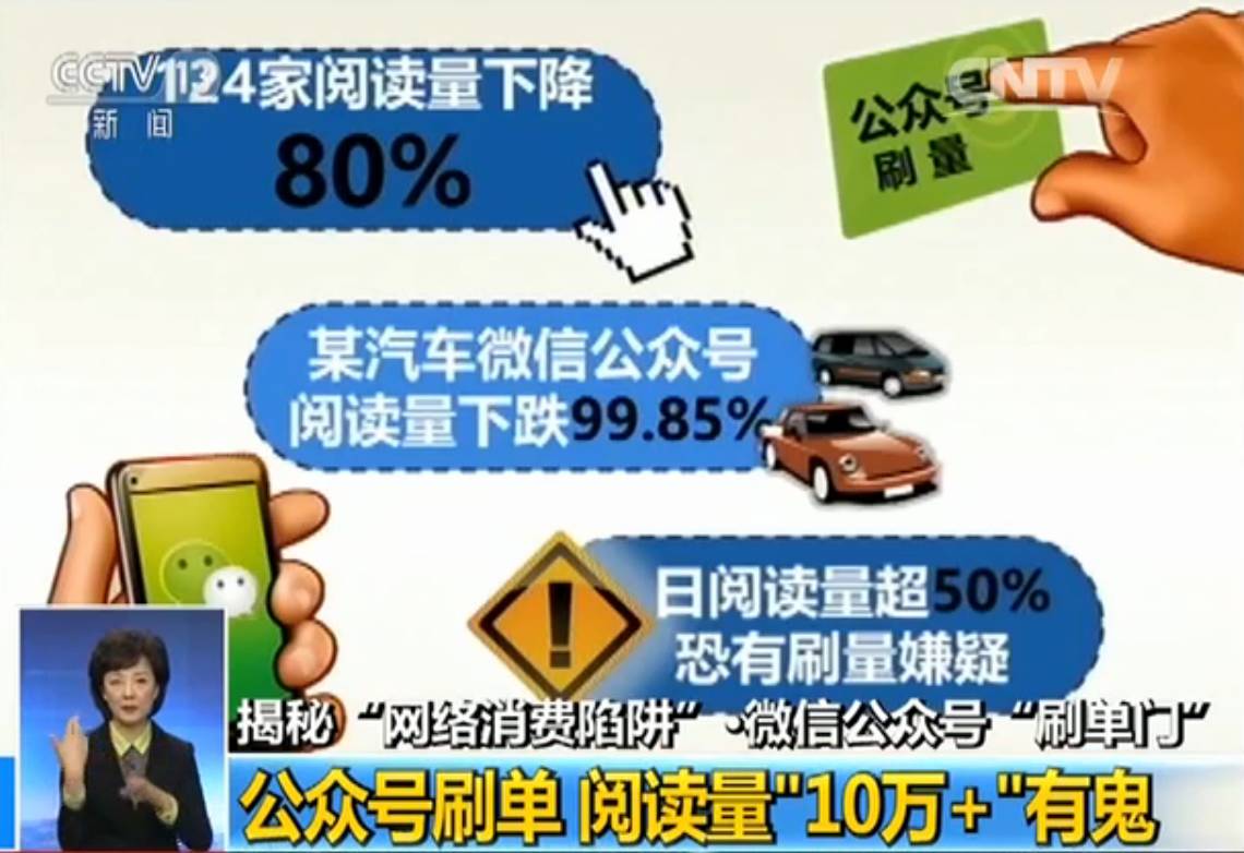 阅读量越大,广告收入越多,追逐利益让部分微信公众号刷单造假。有报告显示,存在数据造假行为的公众大号中,一般来说,数据真实度只有显示阅读数的30.7%。