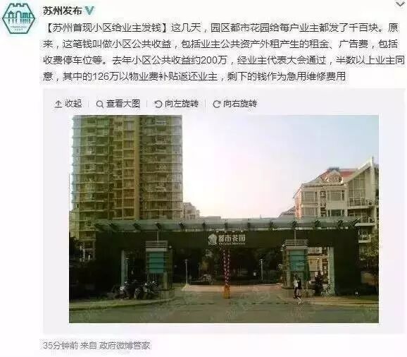 其实,这样的好事在苏州早就有啦!去年7月份,园区都市花园就将公共收益126万以物业补贴发给了业主。