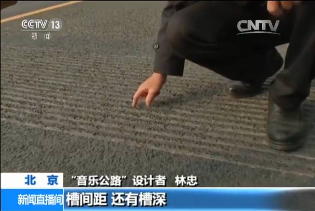 “音乐公路”设计者林忠:“音乐公路是根据不同乐曲的曲调,我们把它设计成不同的槽宽、槽间距和槽深。轮胎与地面的接触声音、与空气的撞击声音就变成有韵律的一个声音,就形成了一条完整的音乐公路。”