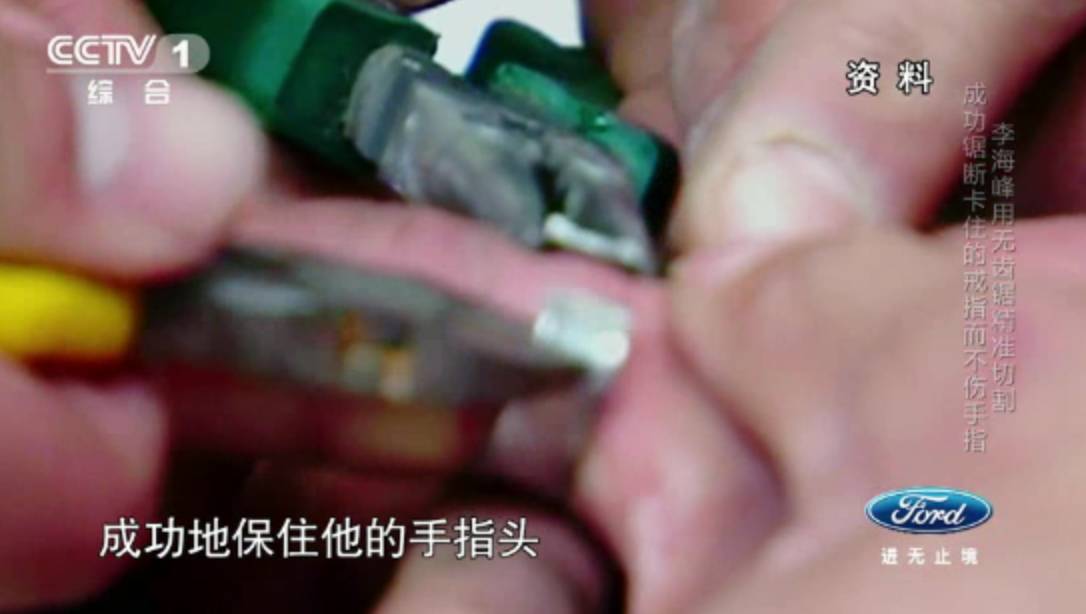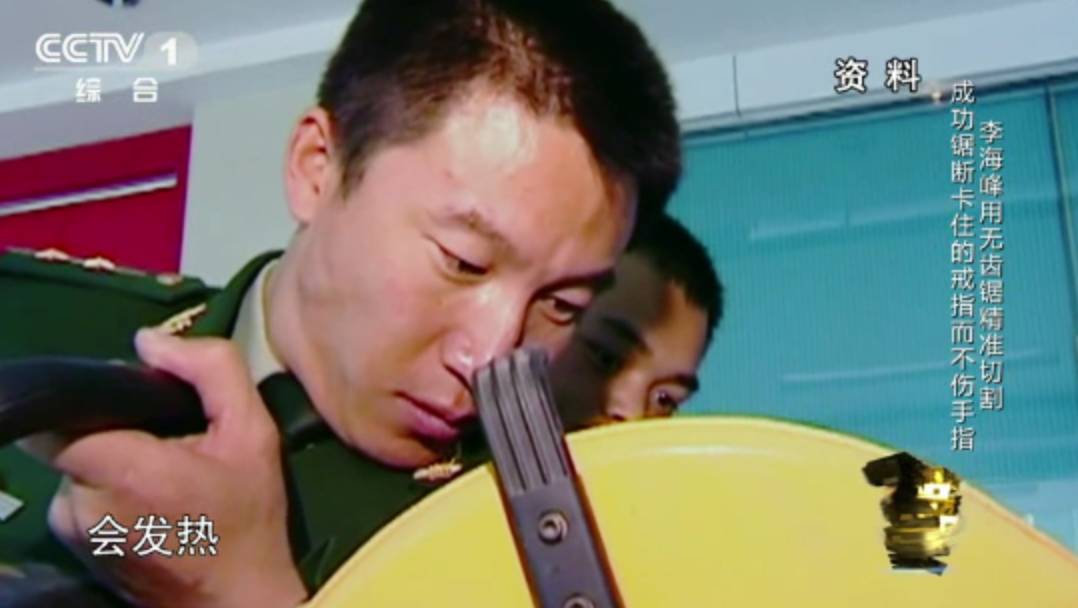 比如,有一次,一个16岁的男孩手上的戒指取不下来,在尝试了钢筋速断器、手钳和锯子等工具都无法切断戒指后,李海峰决定使用无齿锯。