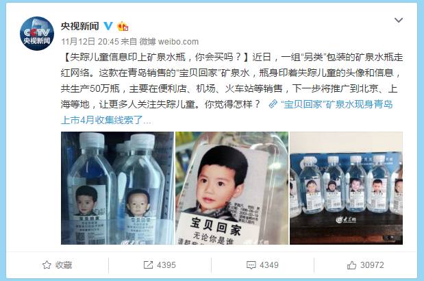 生产此矿泉水的企业负责人表示,“我们与全国最大的失踪儿童网站‘宝贝回家’取得了联系,7月份经家长授权,取得失踪儿童资讯后才登在矿泉水瓶上。”
