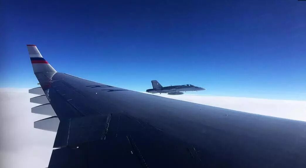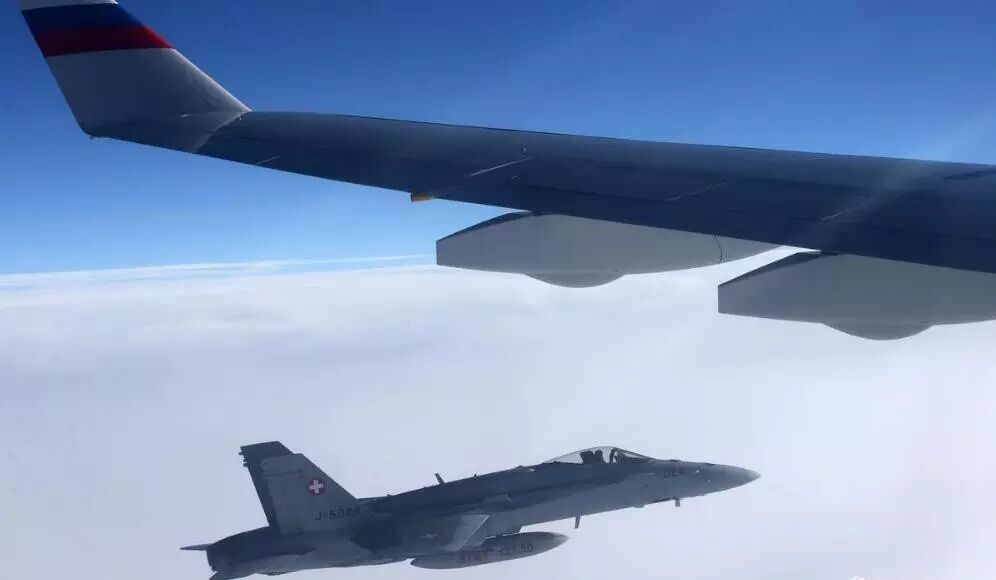 瑞士军机在几分钟内对专机进行抵近跟踪,并靠近至非安全距离。几分钟后,瑞士战机拉出一道长烟离开了。