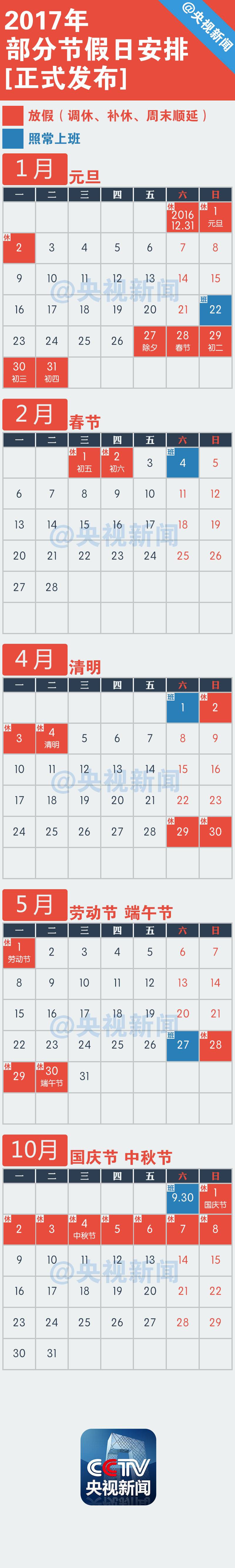 国务院办公厅今日发布2017年部分节假日安排的通知。