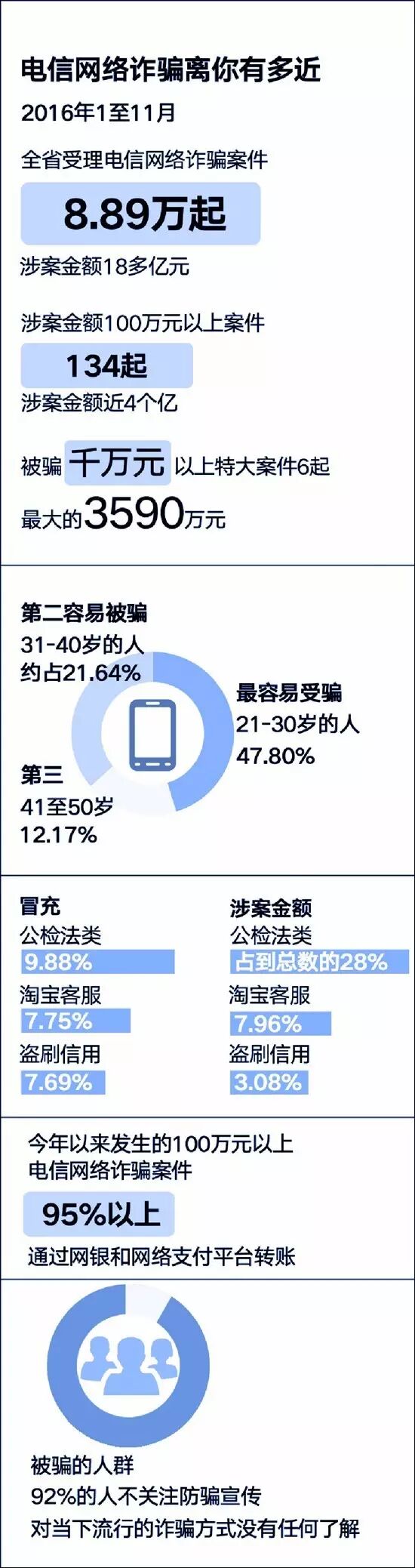 对今年前11个月浙江省电信网络诈骗受害人年龄分析,21-50岁被骗的比例达81%。这部人是社会的中坚力量,掌握的财富最多,也是最大的涉网人群,社会活动频繁,信息泄露也较为严重,是骗子重点攻击的“肥羊”。