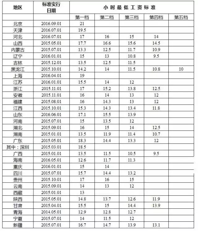 全国各地区小时最低工资标准情况: