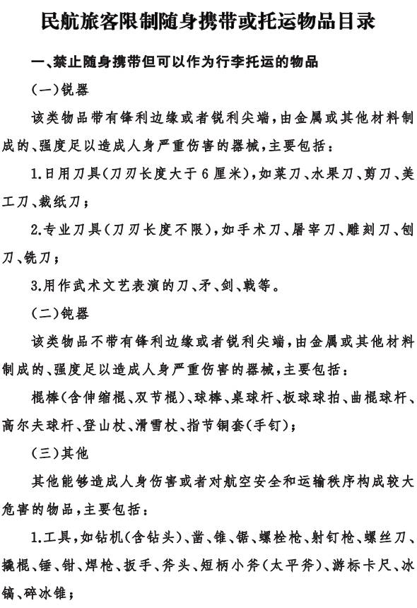 民航局日前公布《民航旅客禁止随身携带和托运物品目录》和《民航旅客限制随身携带或托运物品目录》,自2017年1月1日起开始实施。
