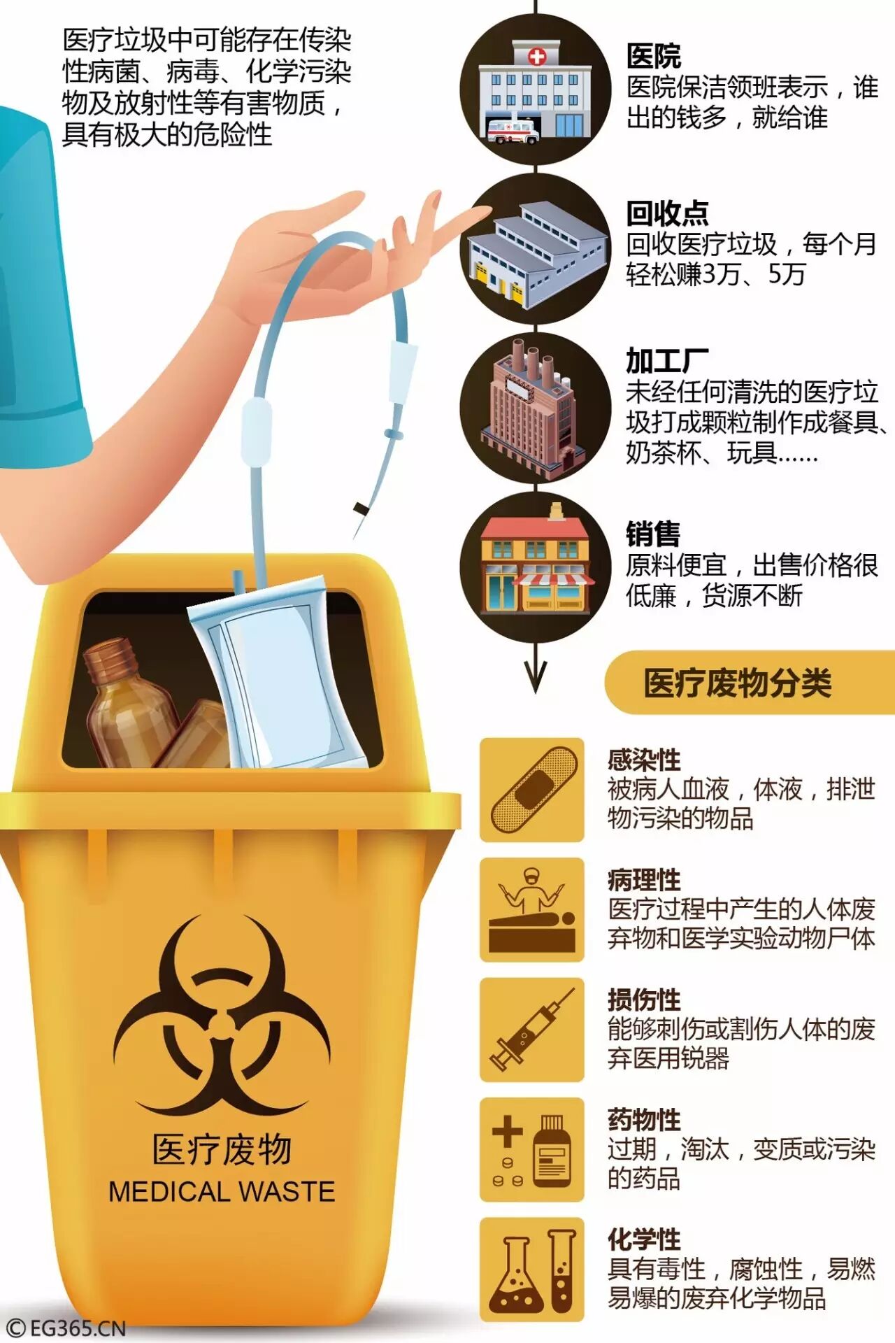 据南京栖霞警方19日通报:南京首起医疗废物污染环境案告破。经查,多家南京本地的大型医院,把已经使用过而且未经处理的输液管、输液瓶、针头等医疗废物随意处置,以低价卖给不具备处理资质的个人,经过转手,这些医疗废物最终被黑心工厂加工成了大家经常使用的垃圾桶、口杯、儿童玩具等成品,悄悄进入我们的日常生活。
