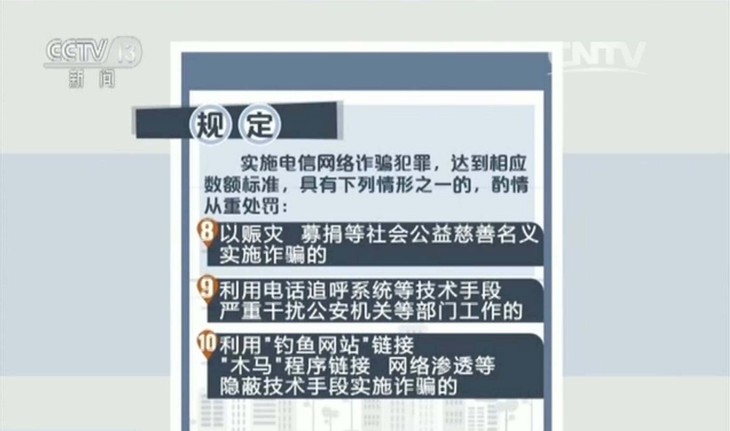 《意见》规定,实施电信网络诈骗犯罪,达到相应数额标准,具有下列10种情形之一的,酌情从重处罚: