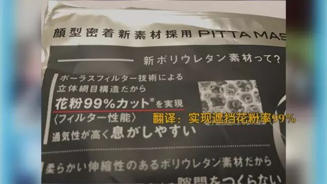为探究这款明星同款口罩的真实面目,记者专门请人翻译了外包装上的日文说明,结果我们发现,这些说明中竟然没有任何关于防雾霾的文字。有的竟都是防止花粉过敏内容:“实现遮挡花粉率99%,伸张性聚氨酯材料,防止花粉进入。”原来,它的真实身份竟然是一款“花粉防护口罩”!