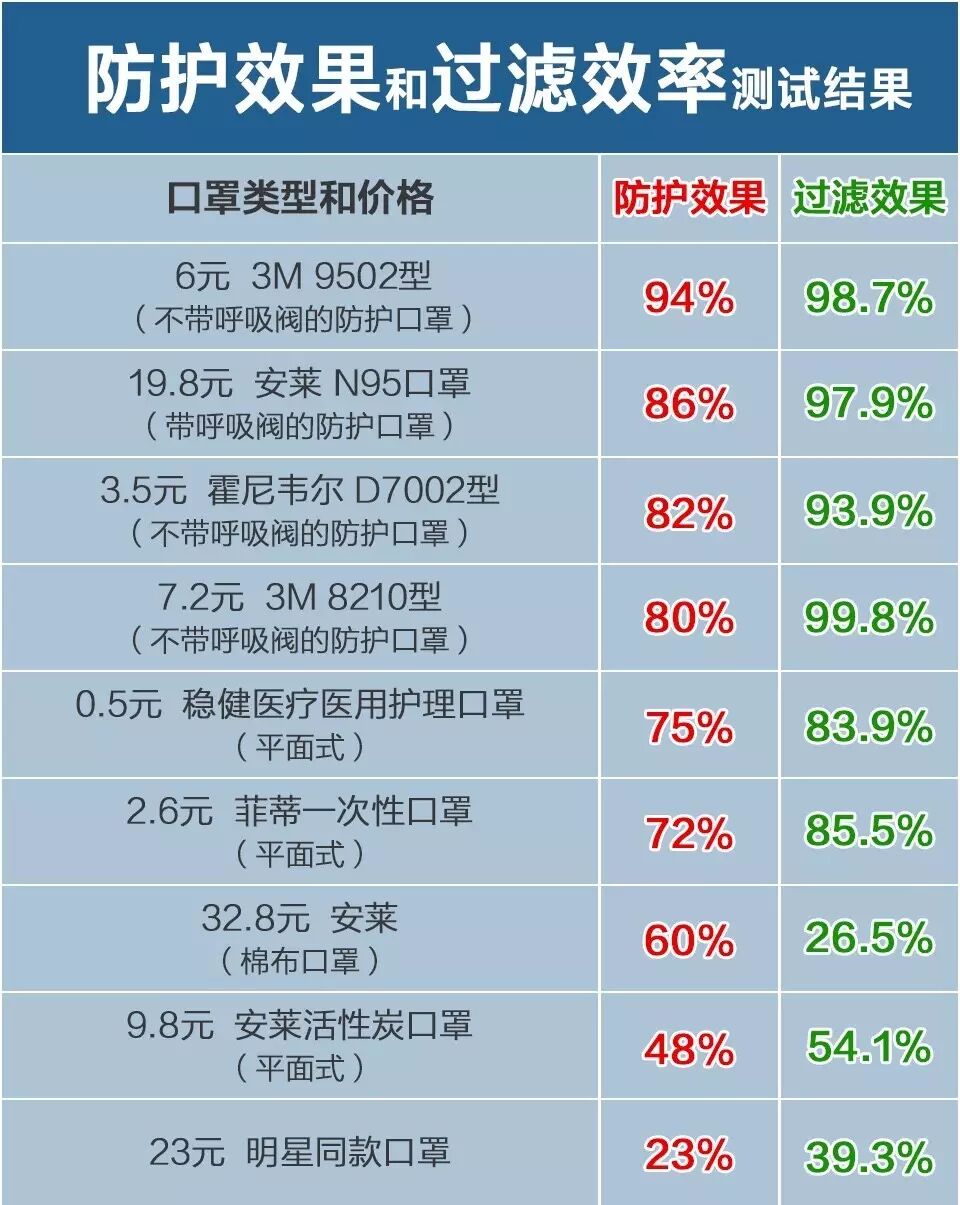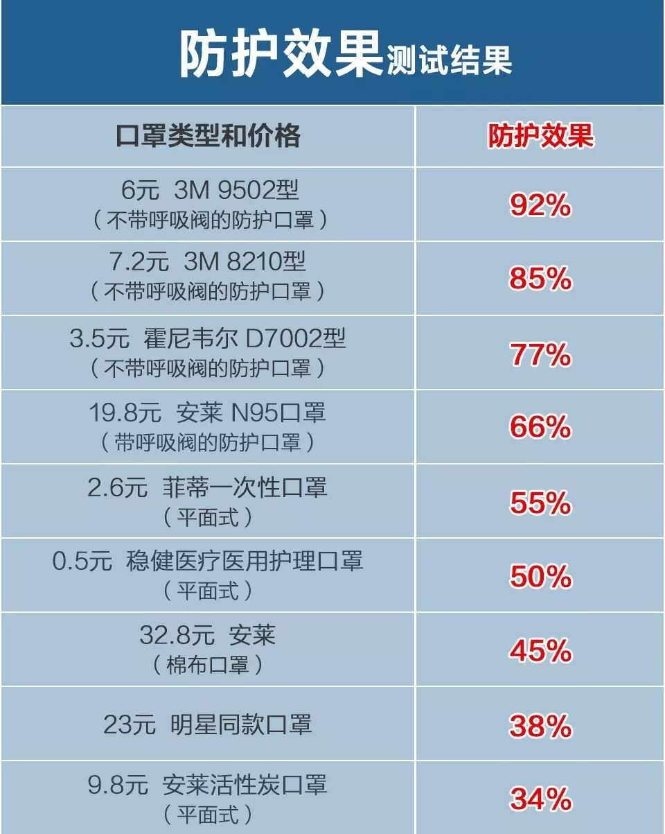 在测试中,不带呼吸阀的3M 9502型口罩表现最好,防护效果达到了92%,价格也处于中等,只有6元。