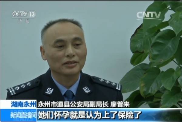 永州市道县公安局副局长廖普来表示,据了解,这些孕妇里最多的应该生了有6个,按她们的行话,怀孕就认为是上了保险了。