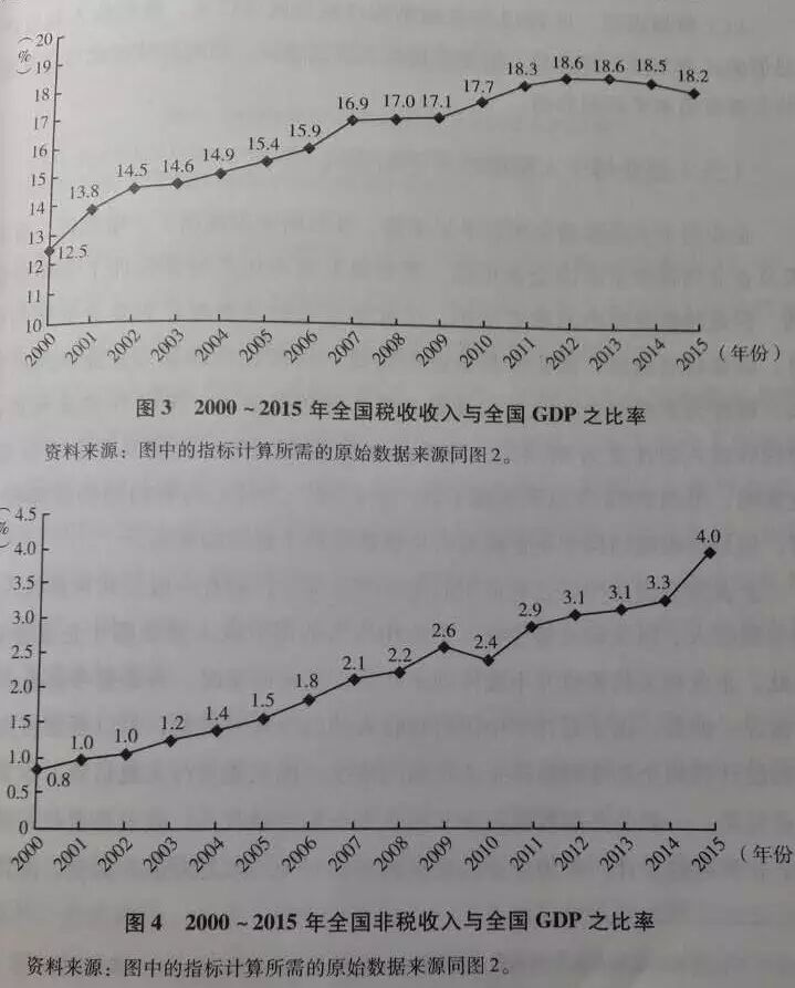 △2000-2015年全国税收收入、非税收入与全国GDP的比率。资料来源:2017年《经济蓝皮书》