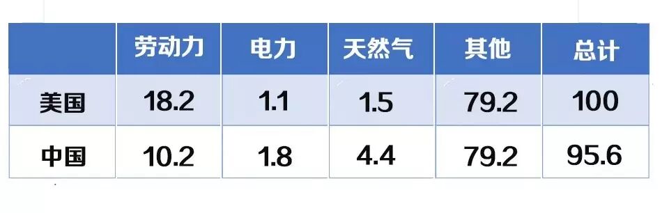 美国制造业的劳动力、电力成本、天然气的成本数值是这样的: