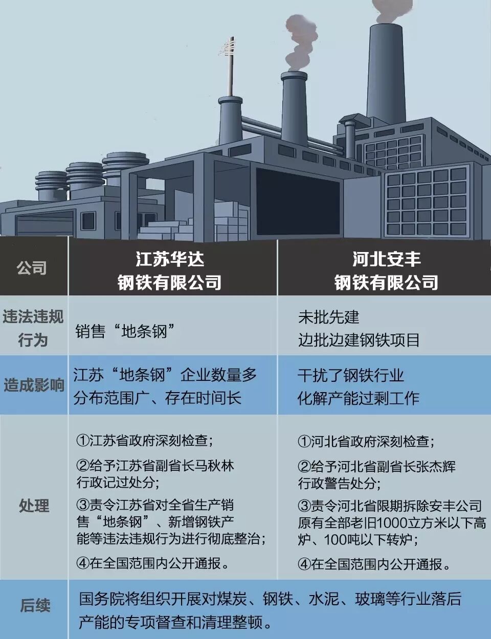 针对江苏华达公司生产销售“地条钢”和河北安丰公司未报先建边批边建钢铁项目等去产能违规违法问题,党中央、国务院23日公开通报了调查处理结果:给予江苏省一副省长行政记过、河北省一副省长行政警告处分,此外,两省分别对111名和27名责任人进行问责。