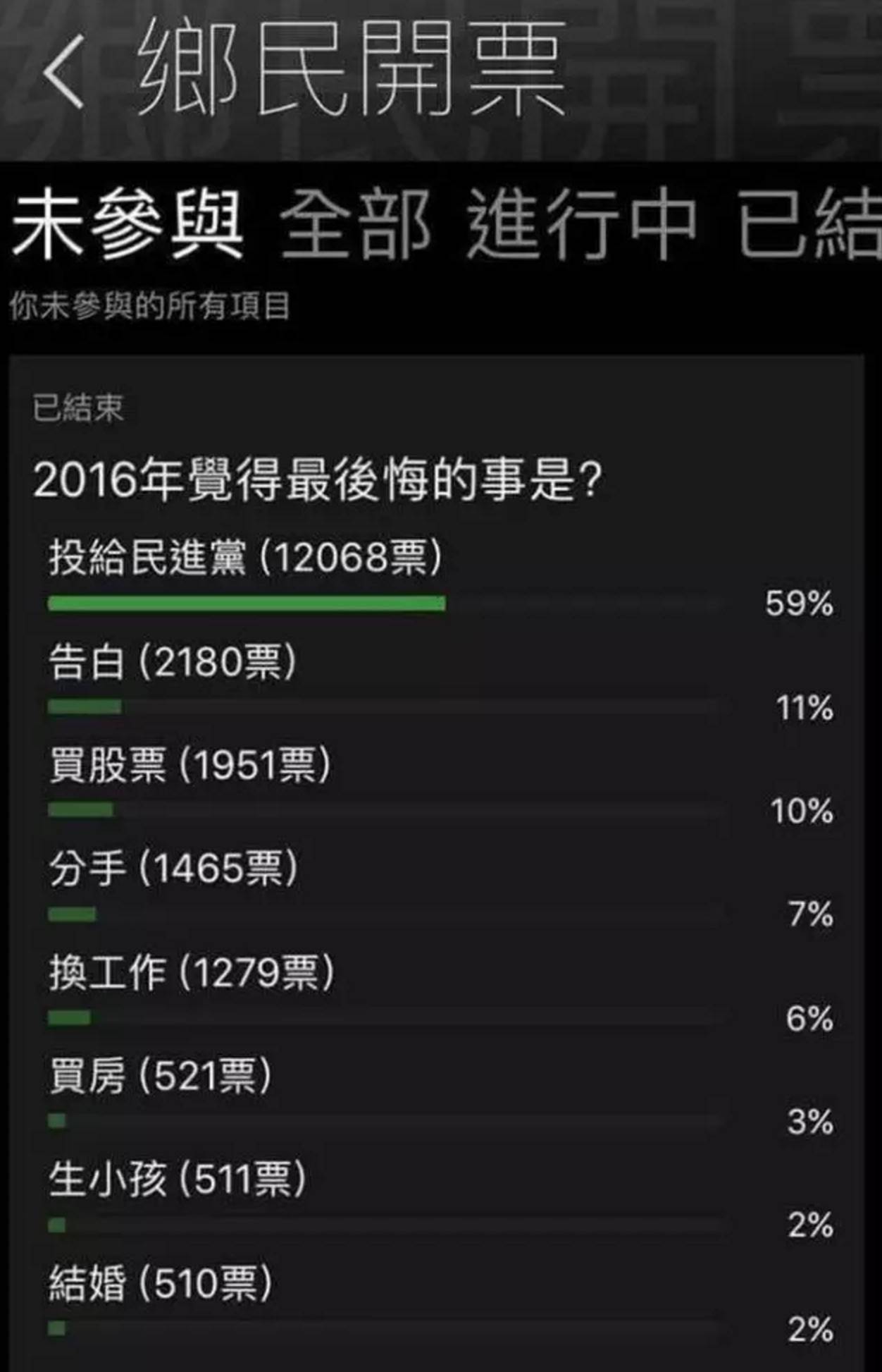 2016年底,PTT乡民(注:台湾知名论坛网民)举办了一个网络投票,问题是“2016觉得最后悔的事是?”,最后“投给民进党”票选获得第一名,得票率59%。