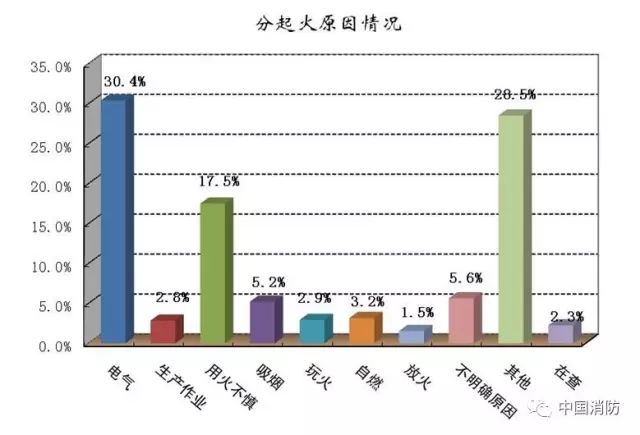 从引发火灾的直接原因看,因违反电气安装使用规定等引发的火灾占总量的30.4%,因用火不慎引发的占17.5%,吸烟引发的占5.2%。