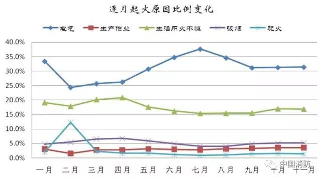 从每月火灾的原因比例分析,夏秋电气引发火灾的比例明显高于冬春,冬春用火不慎引发火灾的比例高于夏秋,玩火(主要为燃放烟花)引发的火灾多集中于春节所在的2月份。