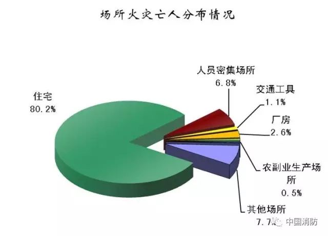 从人员伤亡分布看,住宅火灾死亡1269人、伤713人;人员密集场所火灾亡107人、伤134人;厂房火灾亡41人、伤55人;交通工具火灾亡17人、伤30人;仓储场所火灾亡12人、伤22人。