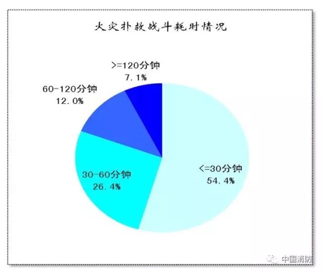 从火灾扑救情况看,54.4%的火灾在30分钟内被迅速扑灭,26.4%的火灾在30分钟至1个小时内被扑灭,12%的火灾扑救时间在1至2个小时内,只有7.1%的火灾扑救时间超过2个小时。