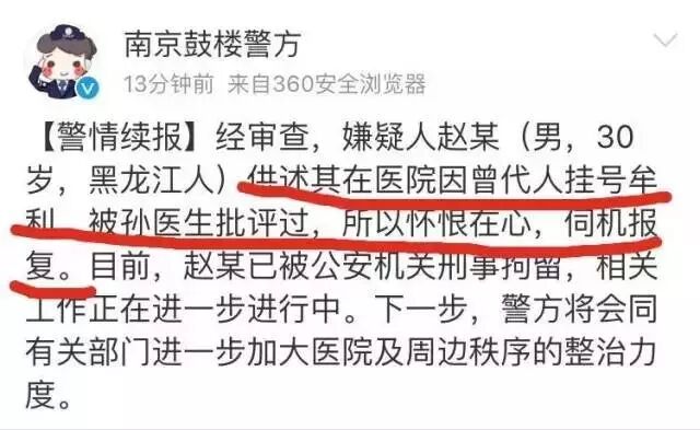 16日下午,南京市公安局鼓楼分局通报称,经审查,嫌疑人赵某(男,30岁,黑龙江人)供述其在医院因曾代人挂号牟利,被孙医生批评过,所以怀恨在心,伺机报复。目前,赵某已被公安机关刑事拘留,相关工作正在进一步进行中。下一步,警方将会同有关部门进一步加大医院及周边秩序的整治力度。